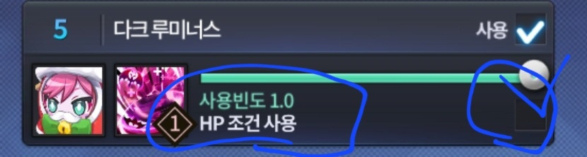 치유형을 사용할 때 HP 조건 사용에 체크 표시가 되있으면 무조건 꺼주세요 안그러면 스킬을 사용할 수 있는 스킬포인트(sp)가