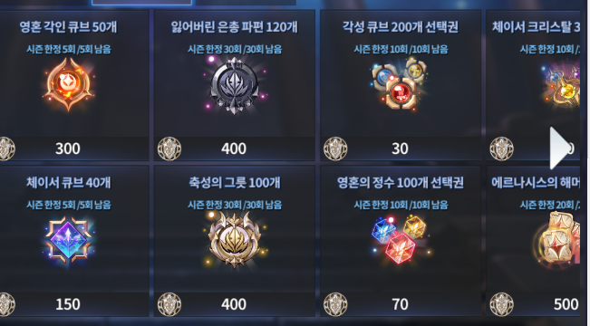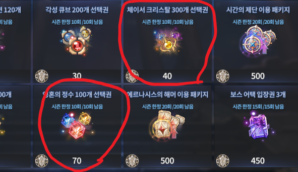 체이서 9개(360주화) + 정수 2개(140주화) 받으면 된다