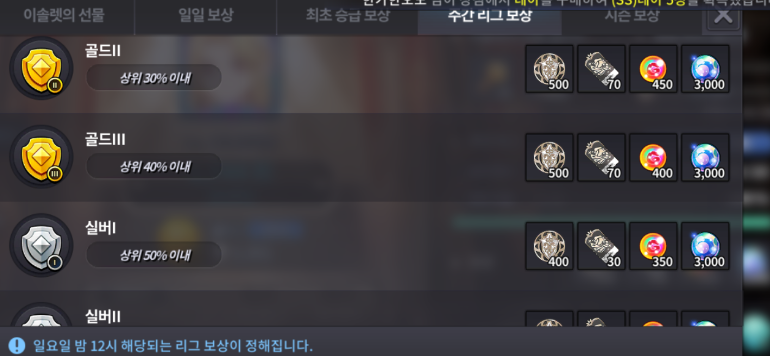 뉴비들은 보통 초반에 실버 ~ 골드로 주간보상을 받을것이다