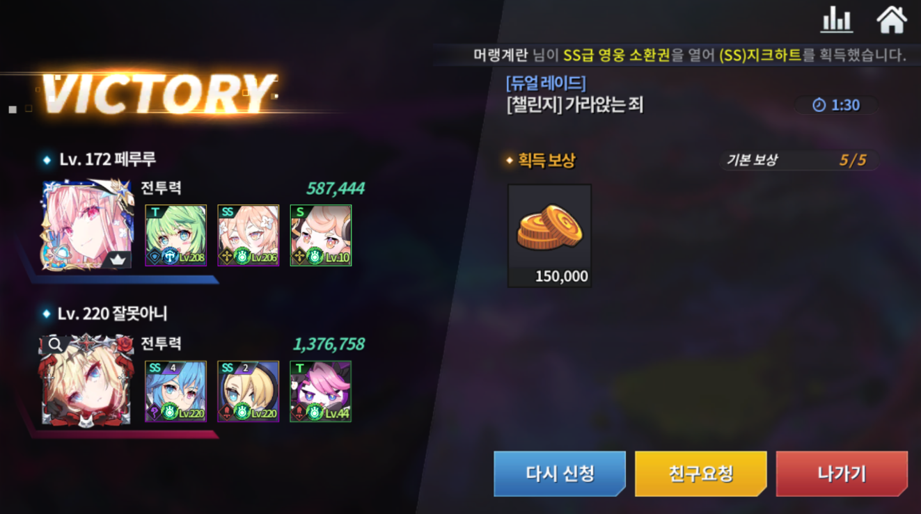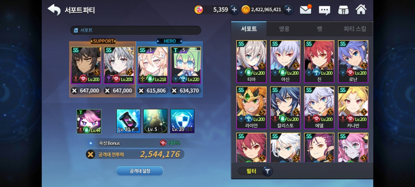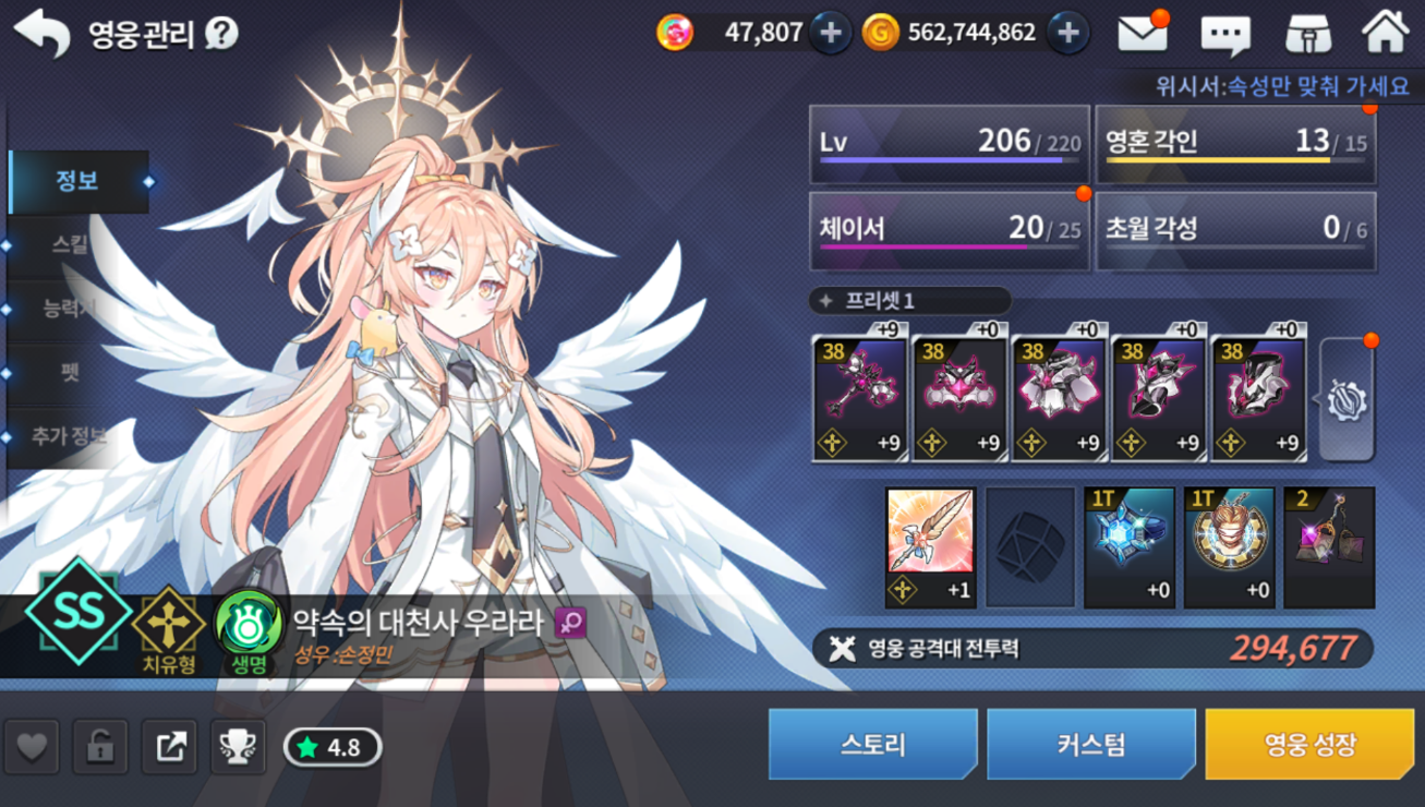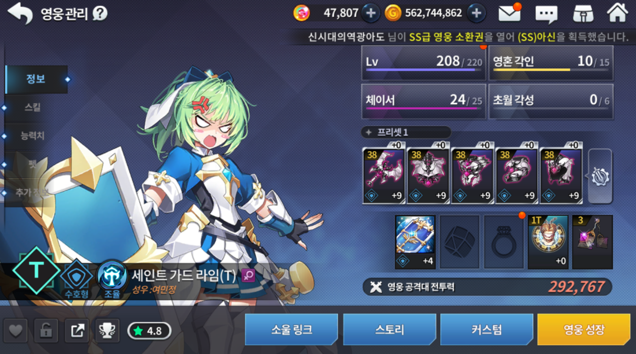 t가 붙는 영웅은 전직 영웅으로 기존 ss 캐릭터의 20 체이서를 달성하신 후 전직 미션을 깨시면 20체이서 상태로 획득하실 수 있습니다.(전직 미션을 깨 전직을 해도 기존 ss 영웅은 사라지지 않습니다.) 20 체이서는 또 뭐냐고 물으실 수 있죠. 섬멸전을 깨서 얻어 획득한 성장 큐브를 획득해 진행하는 건데.. 어차피 뉴비분 들은 섬멸전 모험을 좀 돌려야 열리거든요... 하지만 걱정 마세요.