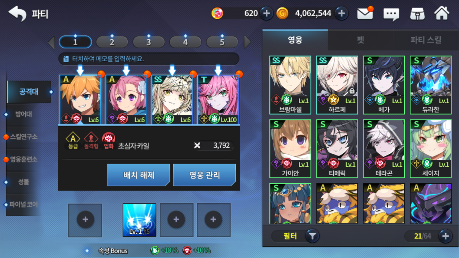 그럼 이런 파티가 됩니다. 물론 캐릭 목록에 SS 등급인 브람마쉘과 하르페가 있는데 없는 셈 치고 이대로 모험을 진행해볼게요.