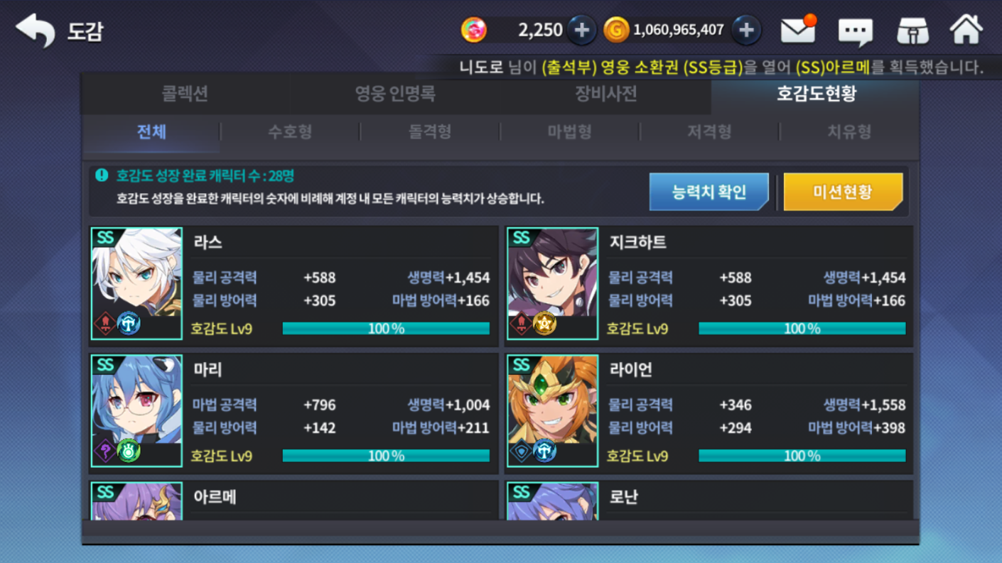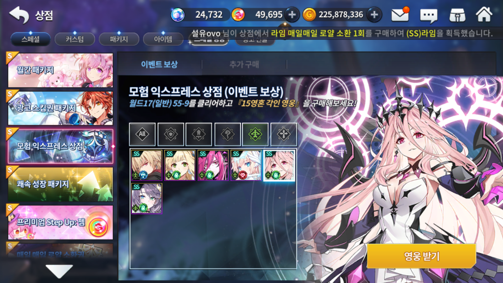 이후 추가로 모험 돌려서 얻은 ss 캐릭터 선택권으로 진을 얻은 다음에