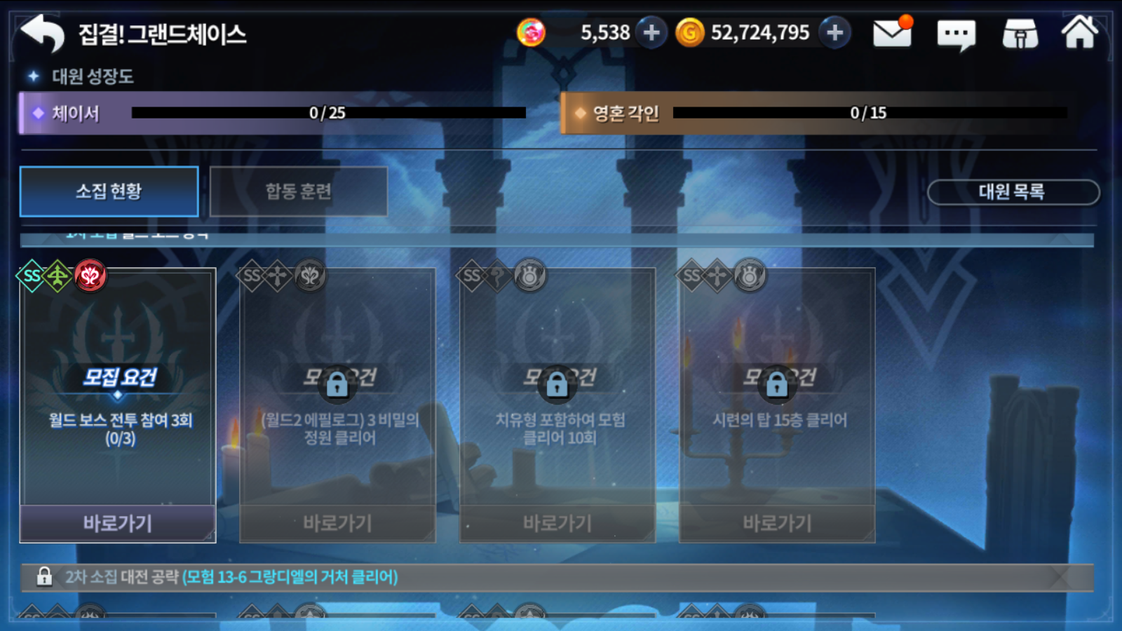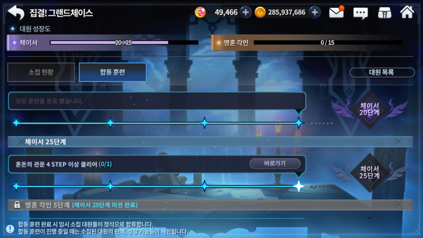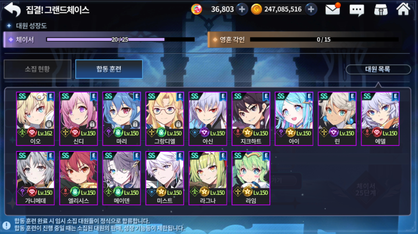 모집이 완료되면 [합동훈련] 탭을 눌러서 25체이서 미션부터 진행해주시면 됩니다!