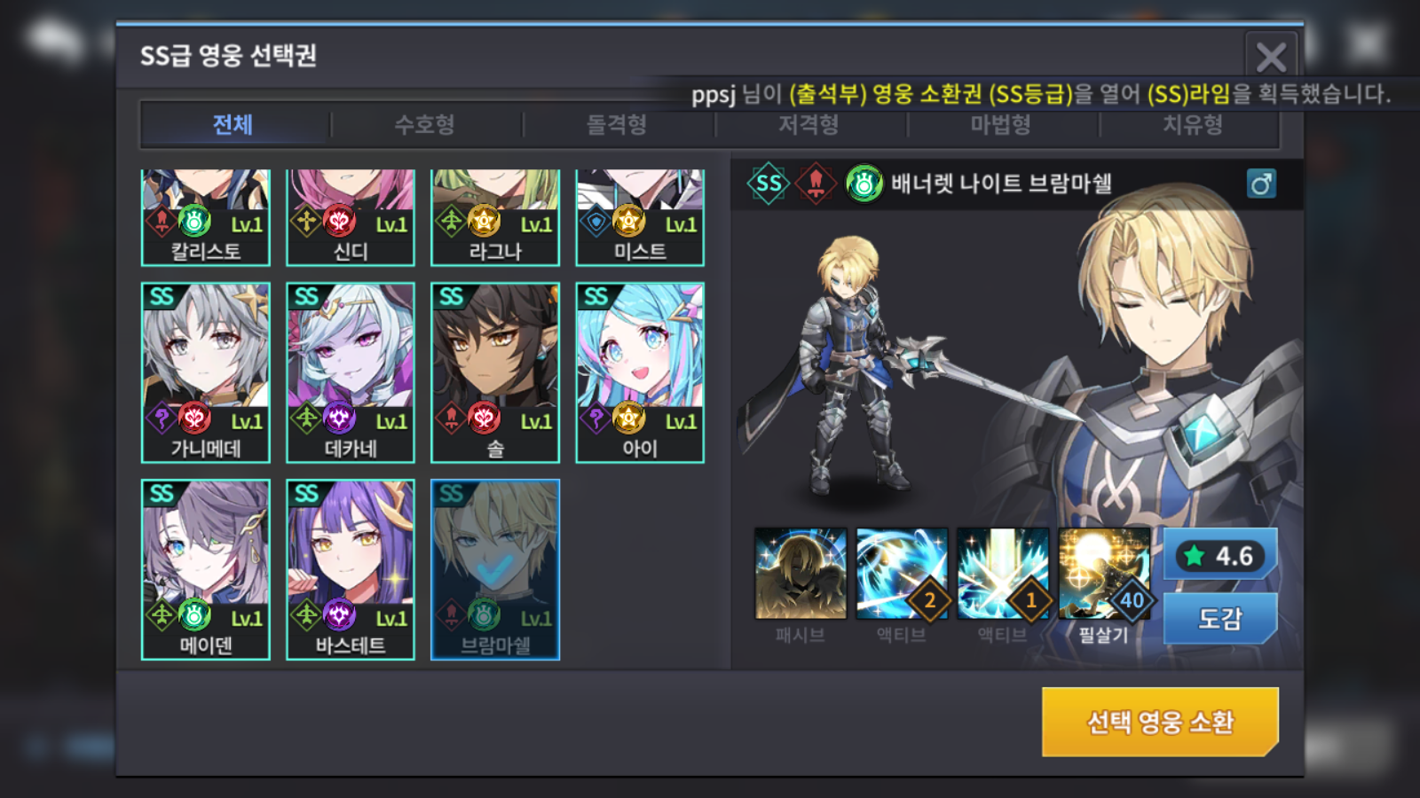 월드1 을 클리어하면 주는 SS 영웅 선택권에서는 [브람마쉘]을 뽑아주세요!