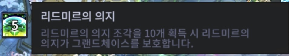 획득시 [리드미르의 의지] 버프가 누적되며 시간 내 전부 획득(10 달성)시 지형 중앙에 보호막이 생성됩니다.