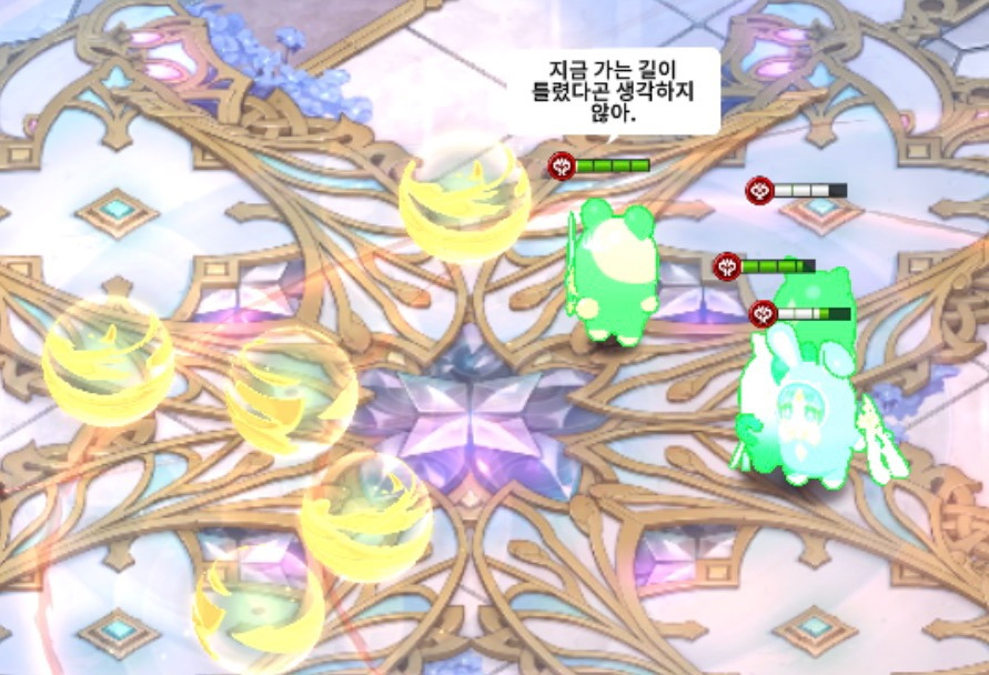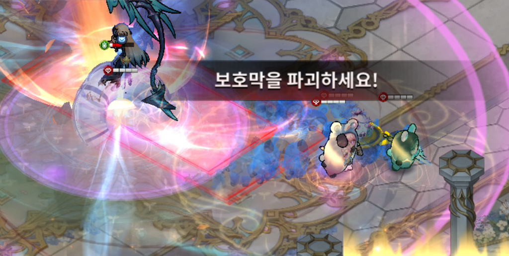 보호막 게이지(보라색): 직접적인 타격으로만 깎아낼 수 있습니다. (이로운 효과 제거 적용 안 됨)