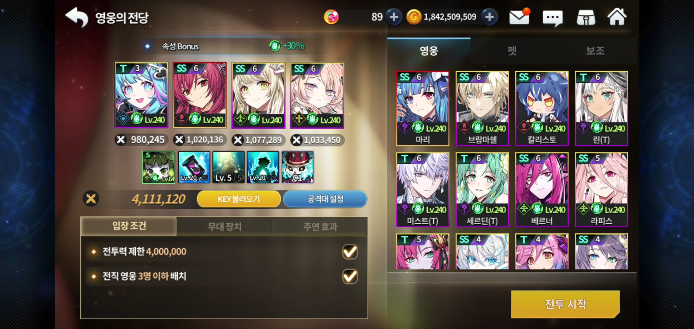 게임이 시작되면 대사촉진 한번 돌린 후 끝없는 성장을 10중첩으로 맞춰주세요.