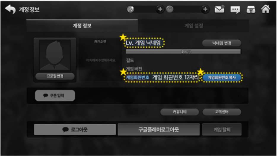 - 게임 회원번호는 '게임회원번호 복사'를 클릭하여 복사할 수 있습니다.