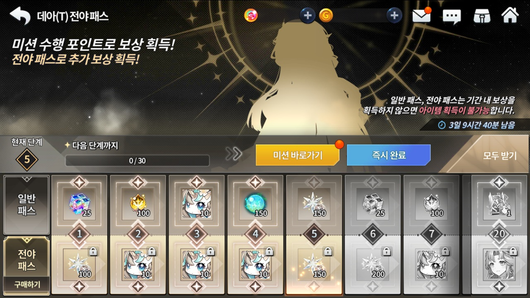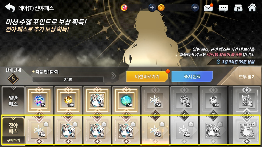 ※ 일반 패스 진행 중 전야 패스를 구매할 경우, 진행 완료한 단계까지 일괄적으로 보상 획득이 가능합니다.