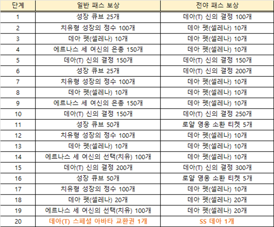 [일반 패스 / 전야 패스 단계별 보상]