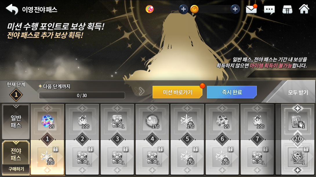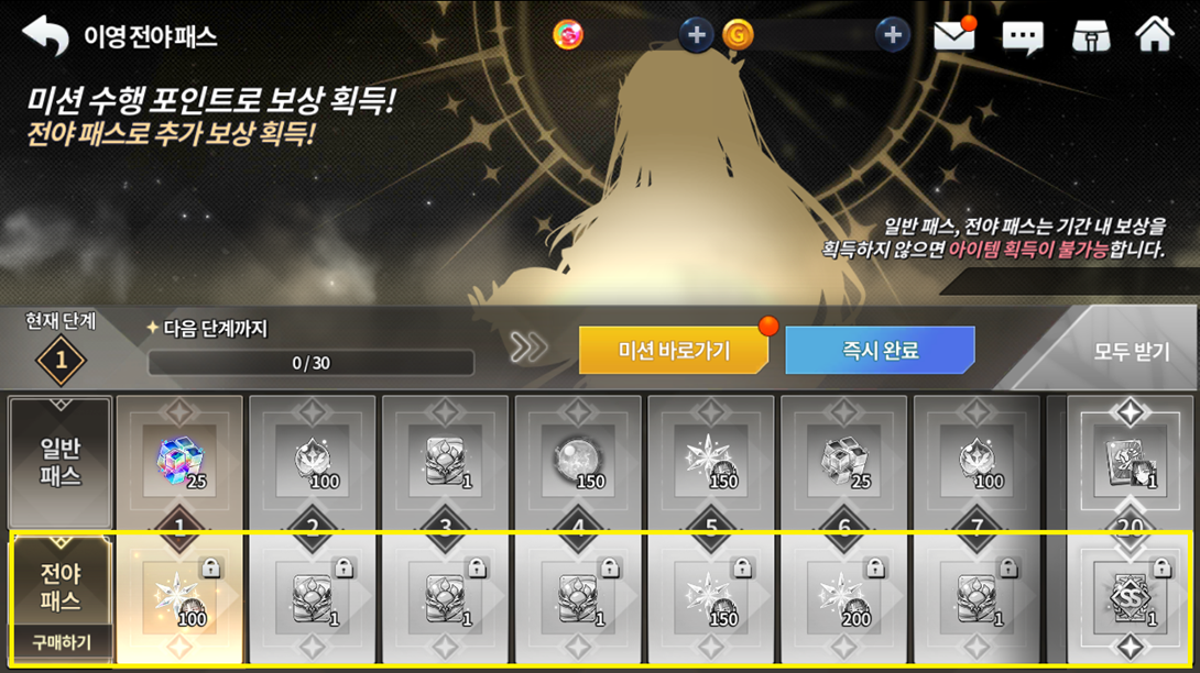 ※ 일반 패스 진행 중 전야 패스를 구매할 경우, 진행 완료한 단계까지 일괄적으로 보상 획득이 가능합니다.