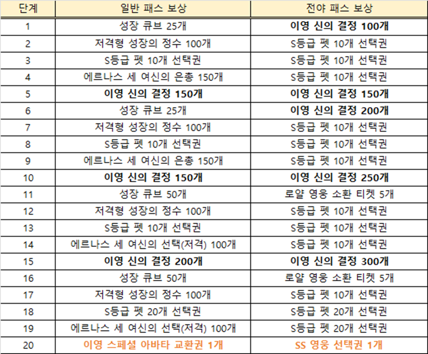 [일반 패스 / 전야 패스 단계별 보상]