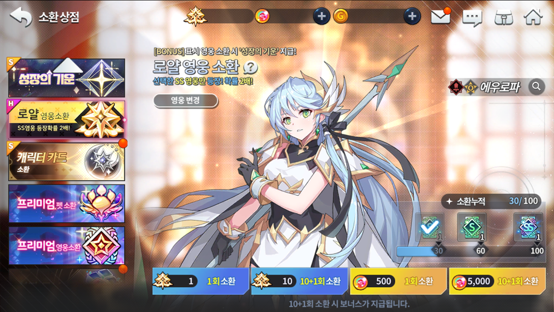 1) 이벤트 기간 중 [메인 로비] > [소환 상점] > [로얄 영웅 소환]에서 대상 영웅을 소환하면 보너스 아이템인 ‘성장의 기운’을 획득할 수 있습니다.