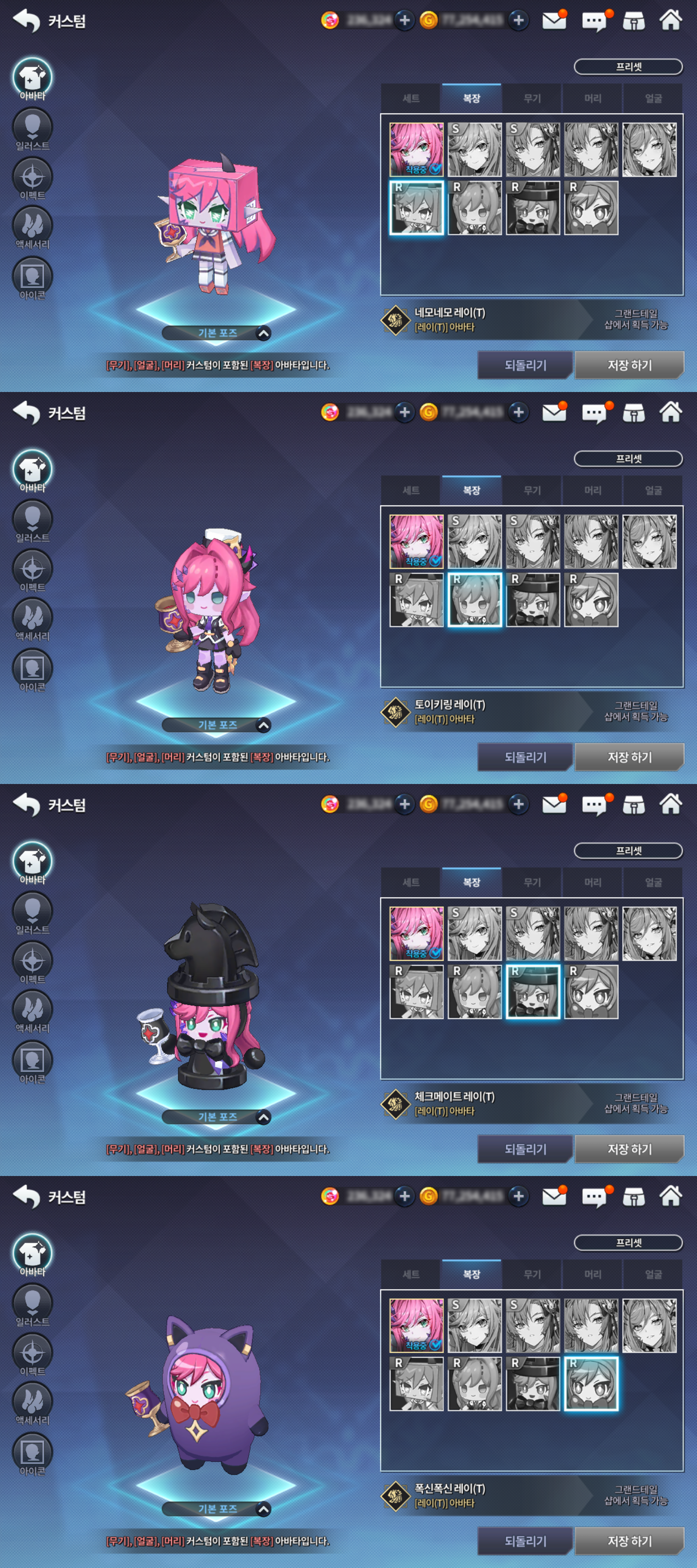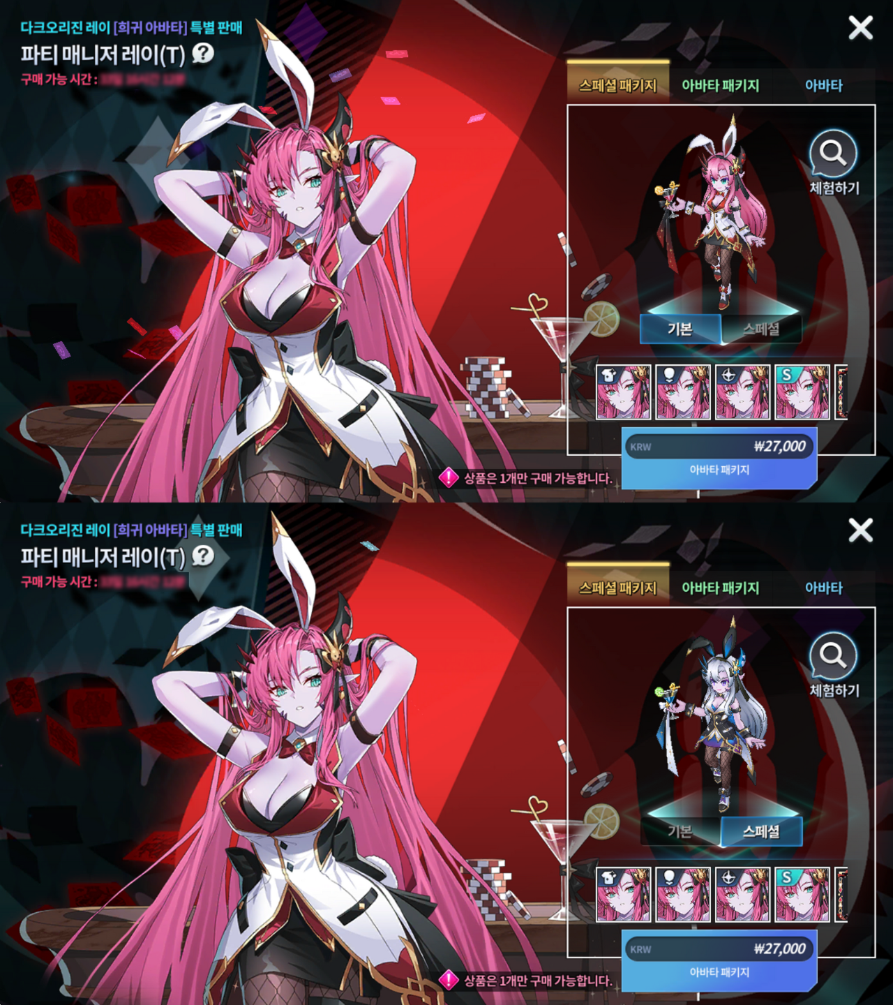 - 해적왕 레이 / 여주인 레이 / 구미호 레이 / 오컬트 매니아 레이 / 셀러브리티 레이는 [레이]를 보유해야만 구매가 가능하고, 임페리얼 나이트 하르페는 [하르페]를 보유해야만 구매가 가능합니다.