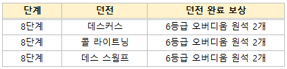 - 6등급 오버디움 원석 : 일반 44Lv, 희귀 135Lv, 전설 375Lv 무기 초월석 중 랜덤 1개 획득