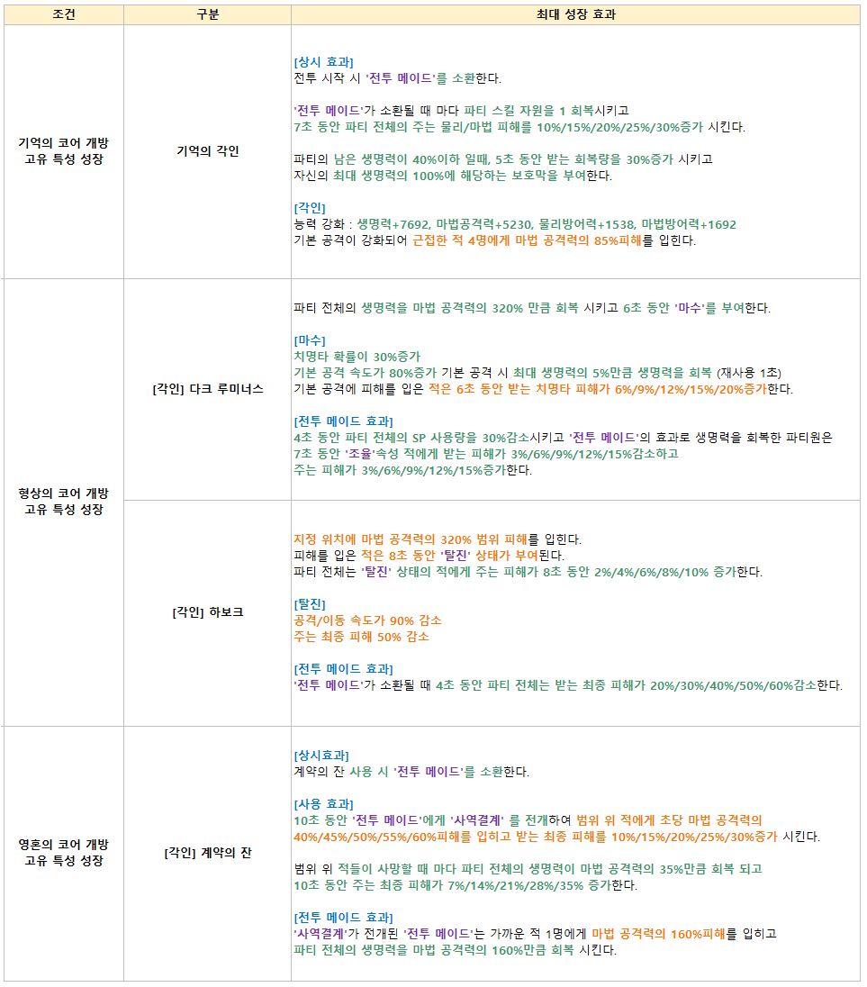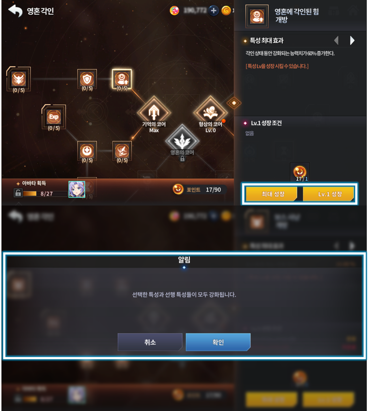 - 상위 특성 강화 시, 선행 특성들이 성장 조건에 맞춰 자동 강화됩니다.