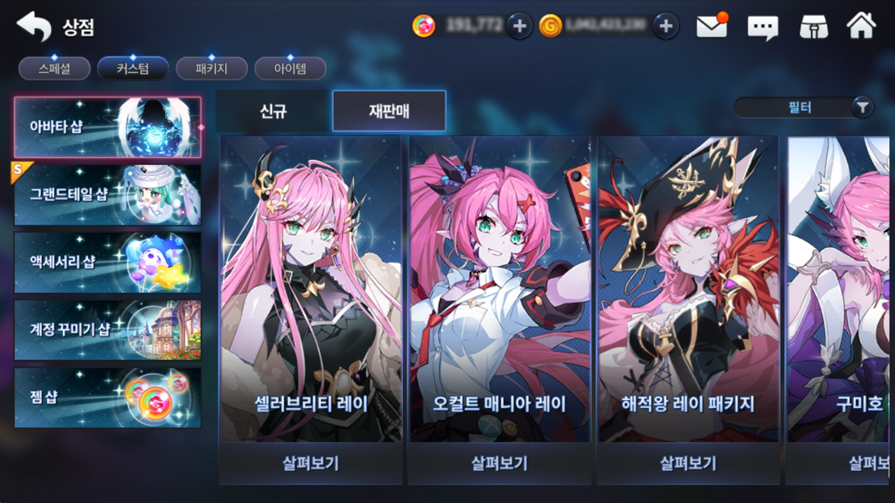 - [상점] → [커스텀 상점] → [아바타 샵] → [재판매]에서 결제를 통해 구매가 가능합니다.