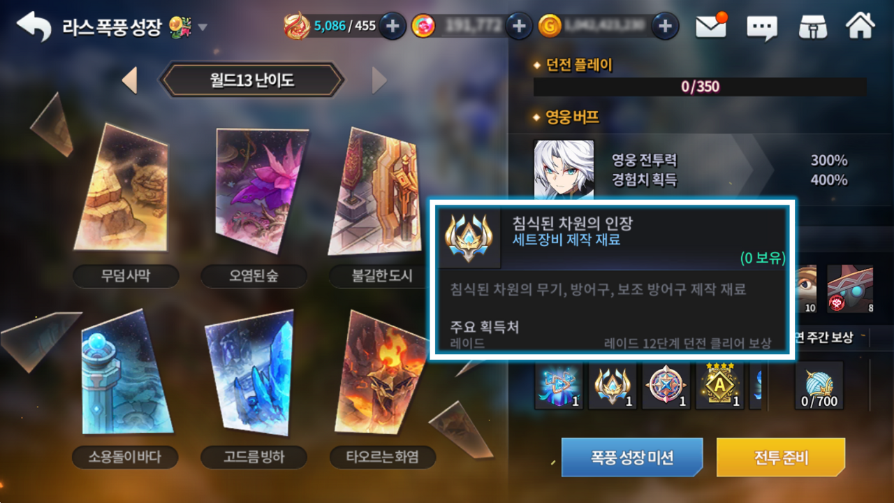 ■ 모험 던전 월드 13 및 폭풍 성장 던전의 월드 13 난이도 획득 가능 보상 내 세트 장비 제작 재료가