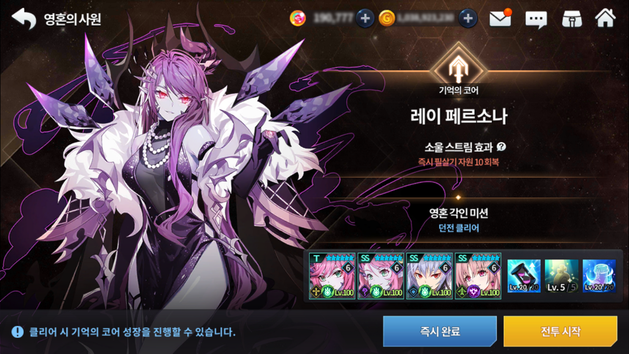 - 영혼의 사원은 해당 영웅을 포함한 고정된 파티를 제공하며 전투 시작을 터치하여 영혼의 사원을 진행할 수 있습니다.