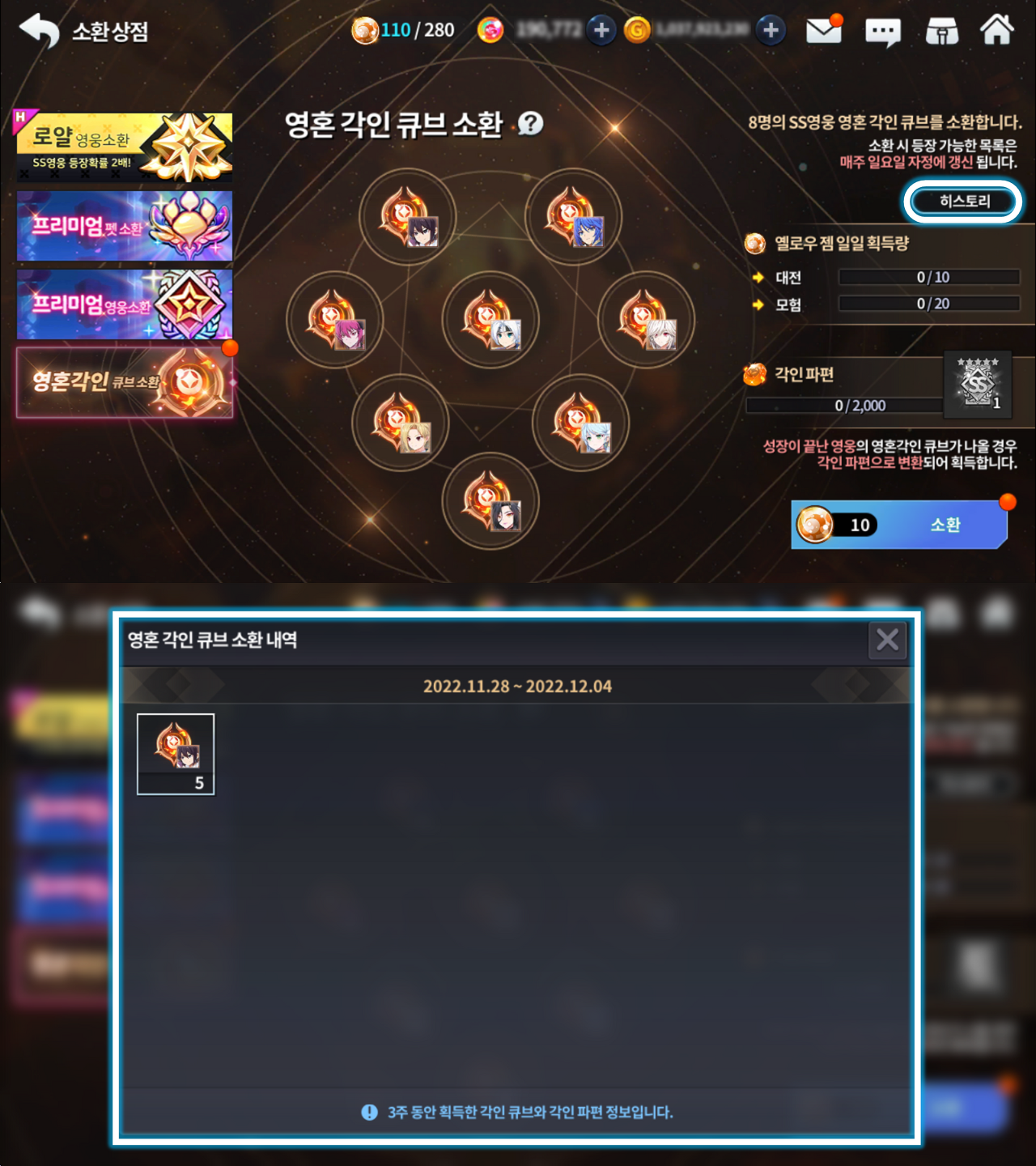 ■ 영혼각인 큐브 소환 내 '히스토리'를 통해 3주 동안 획득한 각인 큐브와 각인 파편 정보를 확인할 수 있도록 개선됩니다.