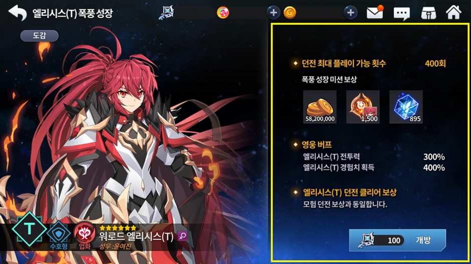 - '전직 영웅' 폭풍 성장 던전은 최대 플레이 가능 횟수가 400회로 정해져 있으며, 400회를 반복 플레이하는 동안 '전직 영웅' 폭풍 성장 미션 보상과 던전 클리어 보상을 획득할 수 있습니다.