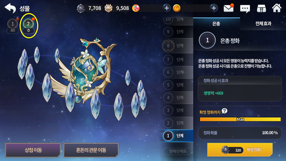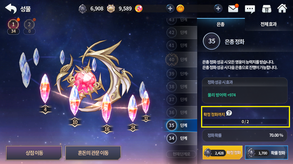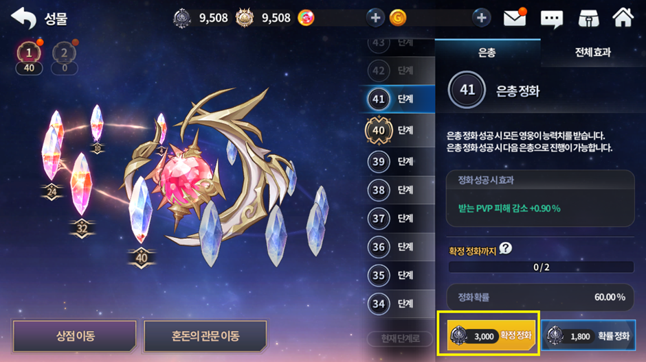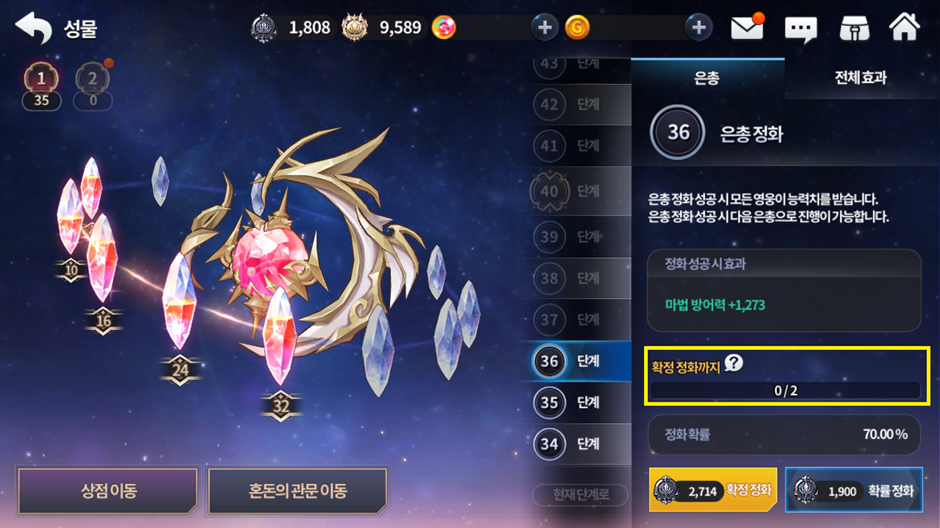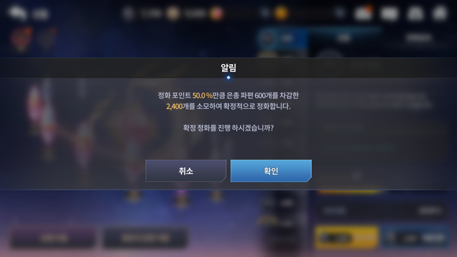 - ‘확정 정화’ 시도 시 해당 단계 정화 성공까지의 확률에 기반한 일정량의 재화를 한번에 소모하여 확정으로 정화 성공이 가능합니다.