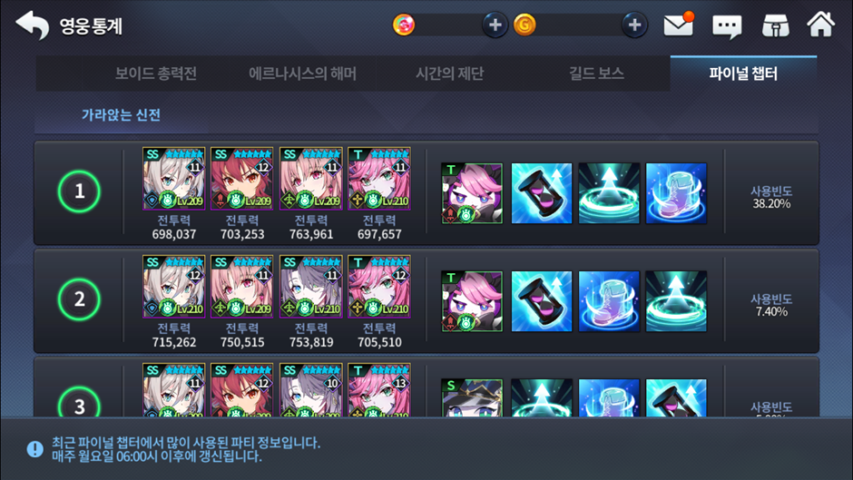 ■ 영웅 통계 UI에 펫 정보가 추가되며, 에르나시스의 해머, 시간의 제단, 길드 보스, 파이널 챕터 컨텐츠 영웅 통계가 추가됩니다.
