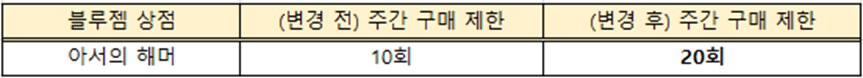 - ‘블루젬 상점에 있는 ‘아서의 해머’ 주간 최대 구매 가능 수량이 증가됩니다.
