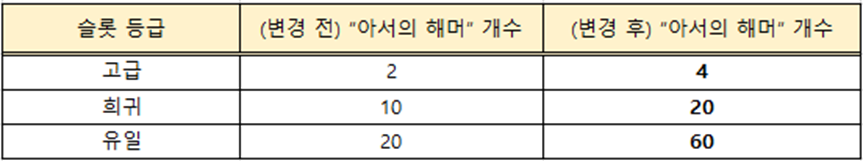 - 이에 따라 슬롯 등급별 최대 사용 수량이 아래와 변경됩니다.