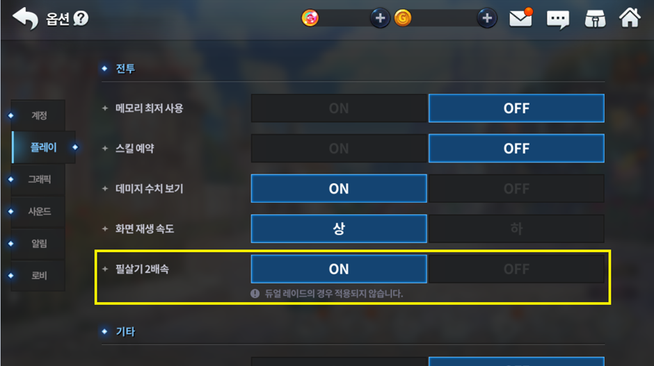 - 해당 기능은 [메인 로비] > [메뉴] > [옵션] > [플레이] > [전투] – 필살기 2배속 ON 설정 시 적용됩니다.