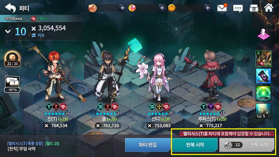 단, 월드 3 (11-1) 이상 모험 던전에 진입 가능한 계정이어야만 서포트 파티가 노출됩니다. 월드 3 (11-1) 모험 던전에 진입이 가능한 이후에는, 월드 1 ~ 2 모험 던전에서도 서포트 파티 선택 및 사용이 가능합니다.