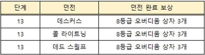 - 8등급 오버디움 상자 : 일반 50Lv, 희귀 145Lv, 전설 405Lv 무기 초월석 중 확률적으로 1개 획득