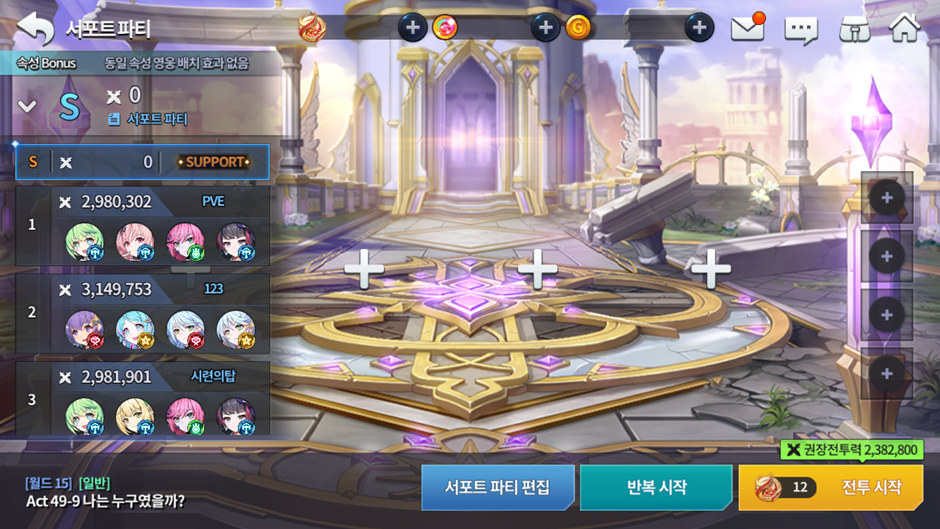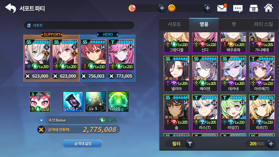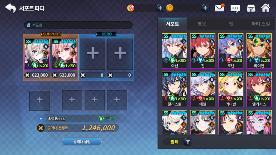 - 서포트 파티 편집을 터치하여, 우측의 [서포트] Tab에 있는 ‘6초월 + 20 체이서 + 영혼 각인 15단계까지 성장된 시스템 제공 영웅’ 중에서 최대 2명을 선택할 수 있습니다.