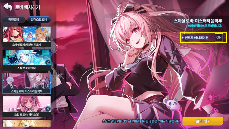 - 스페셜 로비는 인트로 애니메이션 및 전용 BGM이 포함되어 있습니다.