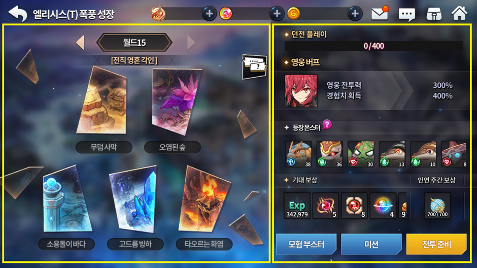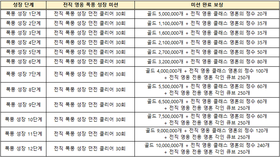 - '전직 영웅' 폭풍 성장 던전은 다수의 일반 몬스터만 등장하는 5개의 던전으로 구성되어 있고, 던전 클리어 보상 종류와 수량은 모험 던전과 동일합니다.