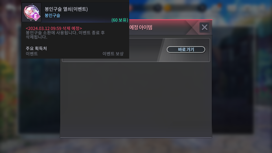 - 이벤트 종료로 인해서 삭제되는 아이템의 기한이 3일 이하로 남았을 경우에 해당 아이템을 보유하고 있으면 확인할 수 있는 기능이 추가됩니다.