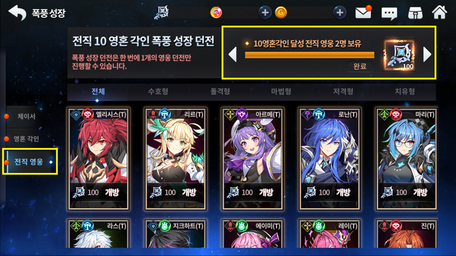- 단, 기존 '체이서 폭풍 성장'이나 ‘영혼 각인 폭풍 성장’을 진행하고 있는 영웅이 있을 경우 '전직 영웅 폭풍 성장’ 진행이 불가능하며, '체이서 폭풍 성장'이나 ‘영혼 각인 폭풍 성장’을 완료해야만 '전직 영웅 폭풍 성장' 던전을 진행할 수 있습니다.