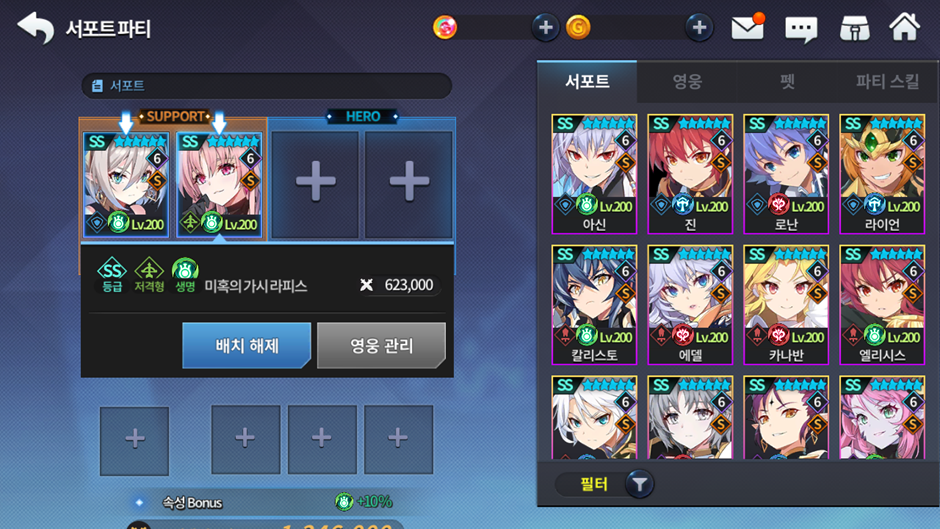 - “모험 및 파이널 챕터의 일반 모드” 던전에서 “6초월 + 20체이서 + 영혼 각인 15단계까지 성장된 시스템 제공 영웅’ 2명을 선택 후 서포트 파티에 대여(배치)하여 사용할 수 있습니다.