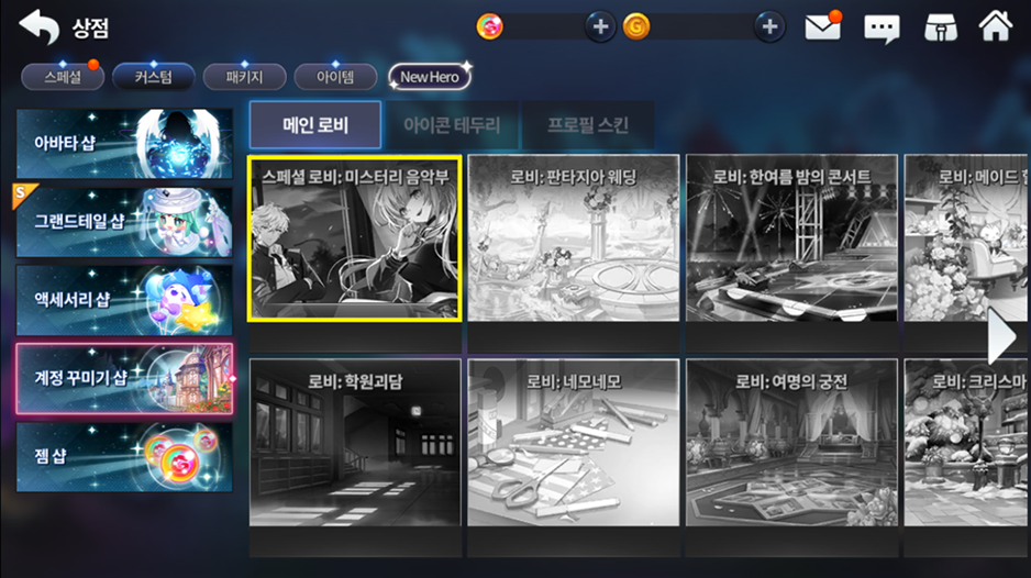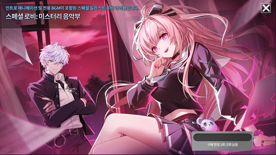 - [상점] → [커스텀 상점] → [계정 꾸미기 샵] → [메인 로비] → [스페셜 로비: 미스터리 음악부] 결제를 통해 구매가 가능합니다.