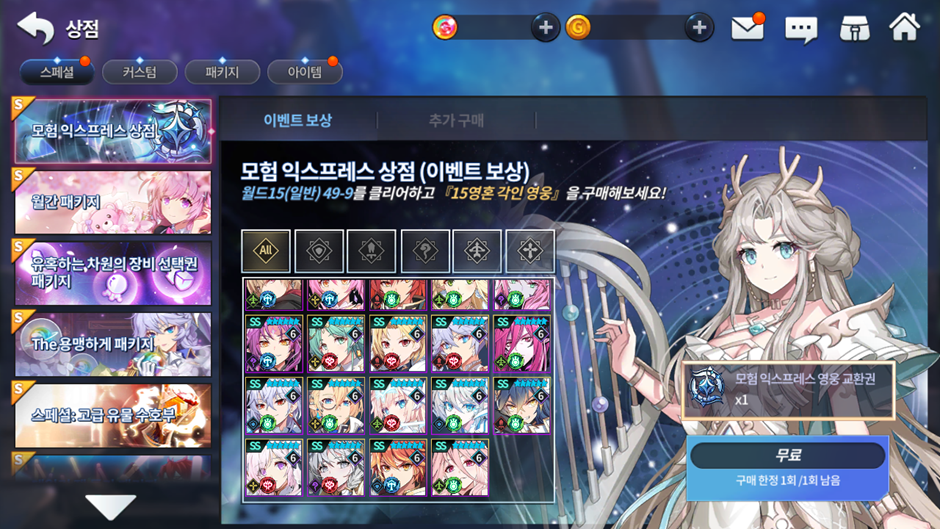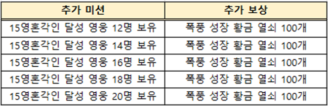 - 월드 15 (일반) 49-9를 클리어 시 ‘6초월 + 20 체이서 + 영혼 각인 15단계까지 성장된 영웅’ 중 1명을 무료로 구매할 수 있습니다. 이는 기존 이벤트 진행 시에 해당 보상을 이미 받은 영웅님도 추가로 구매할 수 있습니다.