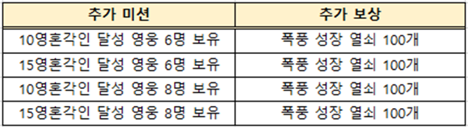 - '전직 영웅' 폭풍 성장 던전 플레이 횟수에 따라 '전직 영웅’ 폭풍 성장 미션 보상을 획득할 수 있습니다.
