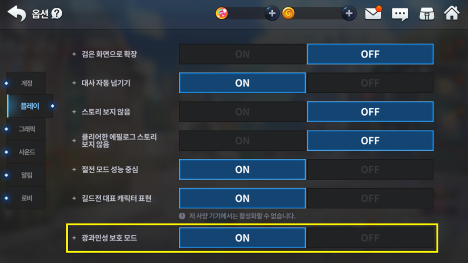 - 해당 기능은 [메인 로비] > [메뉴] > [옵션] > [플레이] > [기타] – 광 과민성 보호 모드 ON 설정 시 활성화됩니다.