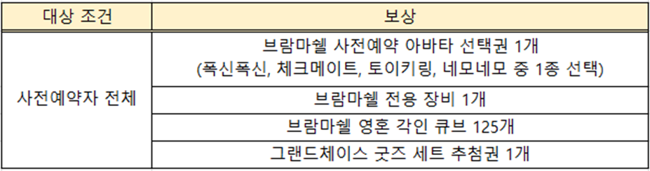 사전예약을 진행하신 영웅님들은 4월 9일(화) 정기 점검 후 접속 시 그랜드체이스 굿즈 세트 추첨권과 함께 브람마쉘 5성, 브람마쉘 전용 보상 3종(전용 장비, 영혼 각인 큐브, 한벌 아바타 선택권)까지 획득할 수 있습니다.