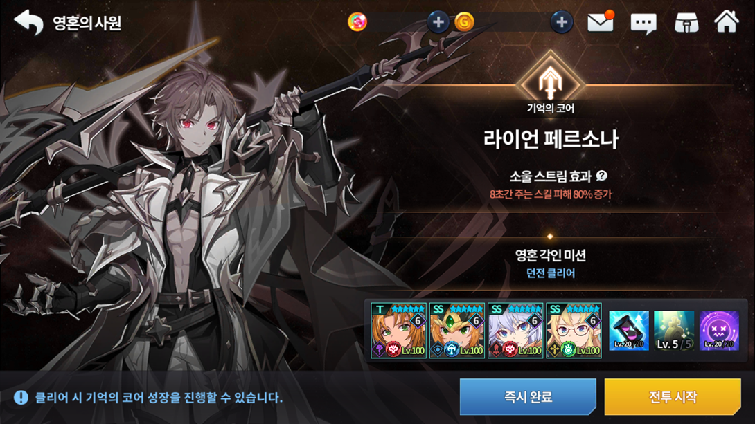 - 영혼의 사원은 해당 영웅을 포함한 고정된 파티를 제공하며 전투 시작을 터치하여 영혼의 사원을 진행할 수 있습니다.