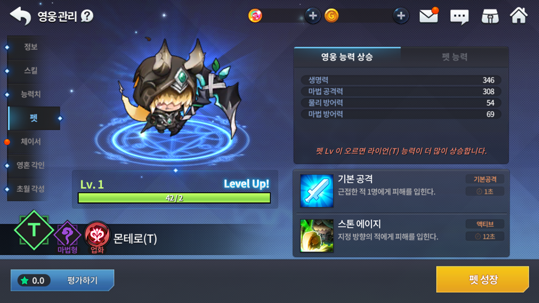- ‘몬테로(T)’ 펫은 ‘부러진 발톱 라이언(T) 영웅’ 획득 시 1 Lv 상태로 획득할 수 있습니다.