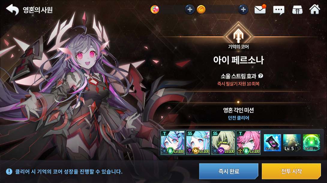 - 영혼의 사원은 해당 영웅을 포함한 고정된 파티를 제공하며 전투 시작을 터치하여 영혼의 사원을 진행할 수 있습니다.