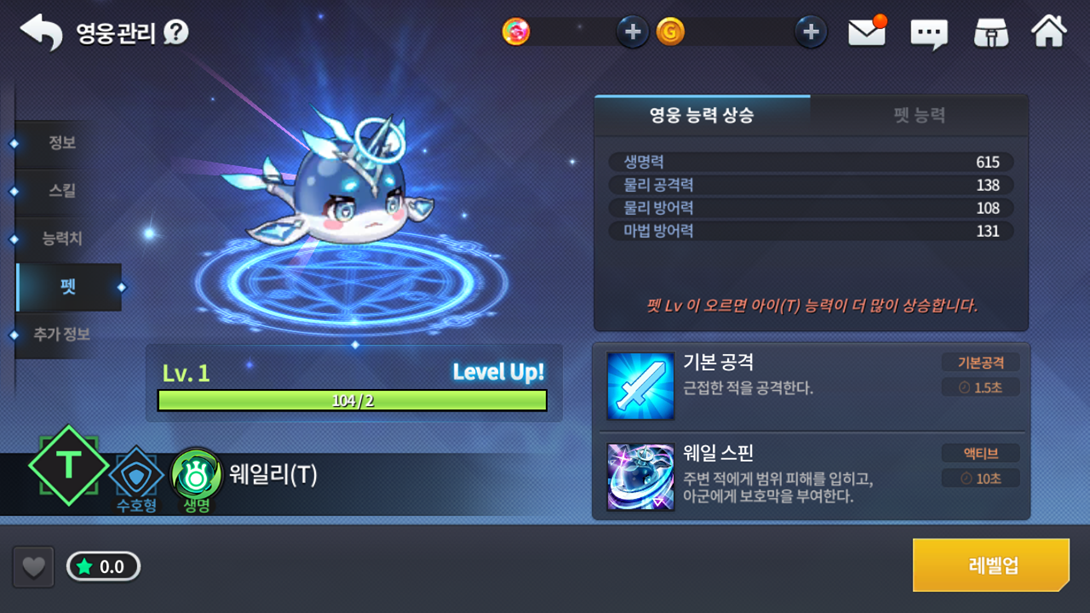 - ‘웨일리(T)’ 펫은 ‘유니버스 가디언 아이(T) 영웅’ 획득 시 1 Lv 상태로 획득할 수 있습니다.