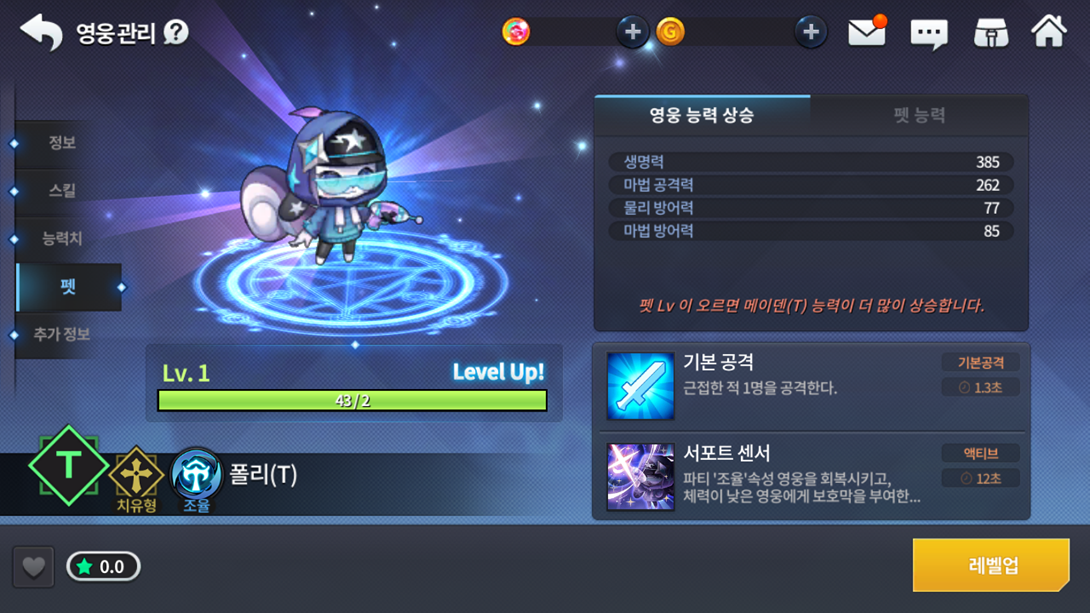 - ‘폴리(T)’ 펫은 ‘인디펜던트 트레이서 메이덴(T) 영웅’ 획득 시 1 Lv 상태로 획득할 수 있습니다.