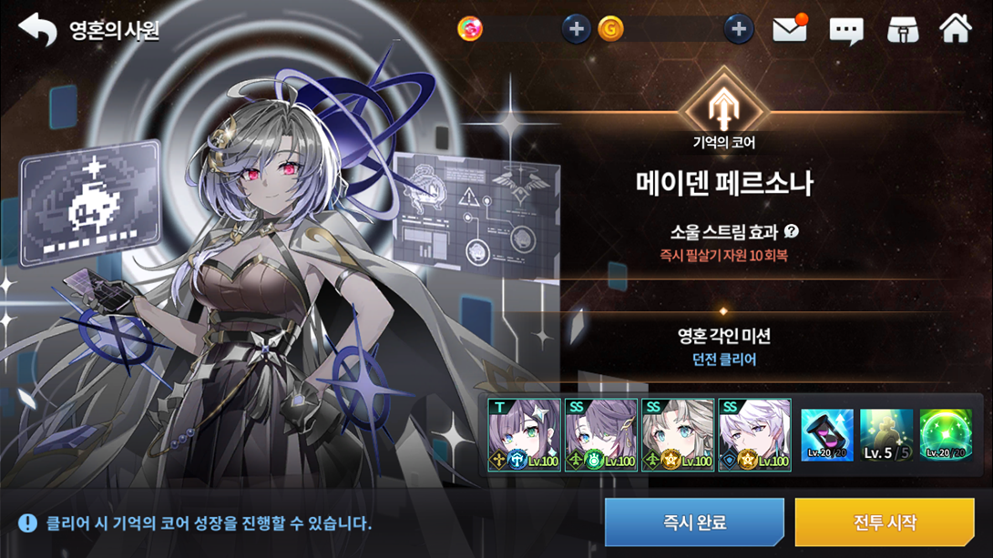- 영혼의 사원은 해당 영웅을 포함한 고정된 파티를 제공하며 전투 시작을 터치하여 영혼의 사원을 진행할 수 있습니다.