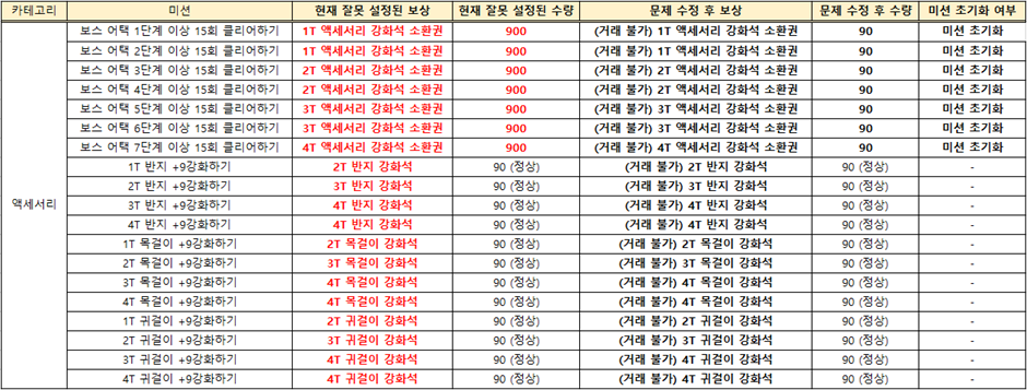 > 임시 점검을 통해 잘못 설정된 ‘액세서리 강화석’ 보상(현재: 거래 가능 상태, 900개 수량)이 수정되며(수정 후: 거래 불가, 90개 수량), ‘액세서리 카테고리’ 도전 미션 중 보스 어택 클리어 미션이 초기화됩니다.